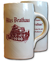 Original Bierkrug "Altes Brathaus" 0,4l mit Schrift-zug und Motiv sowie dem Spruch: "Was ist schon ein Platz an der Sonne - gegen einen Sitzplatz im Alten Brathaus?"